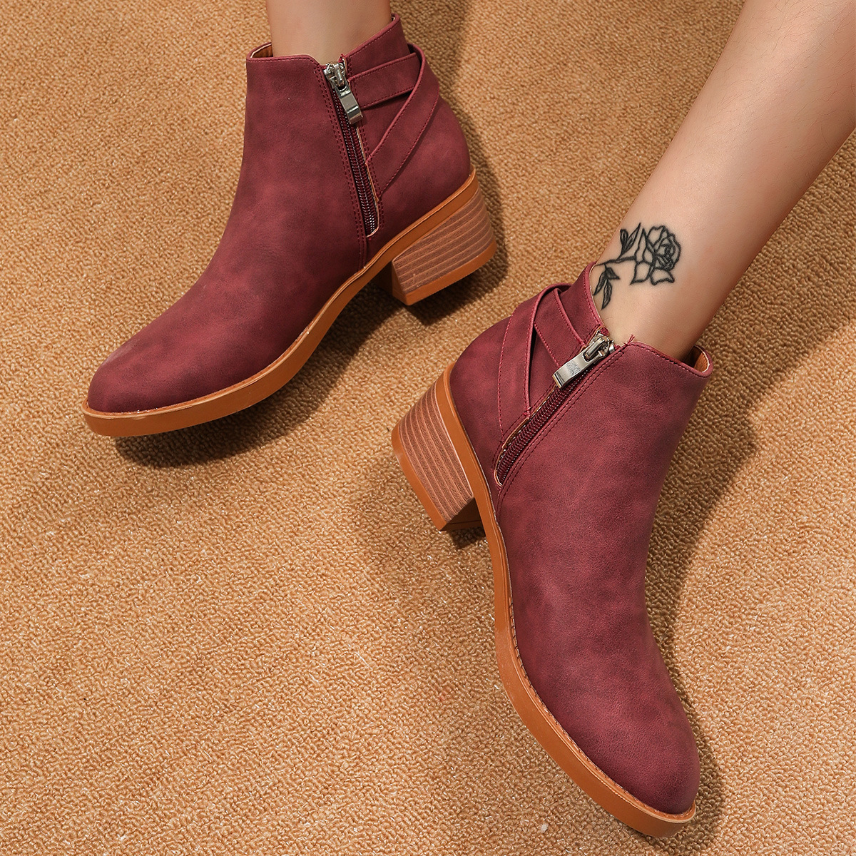 Autumn Winter Round Head Martin Boots Women Zipper Plus Size Chunky Mid Heel Booties Women
